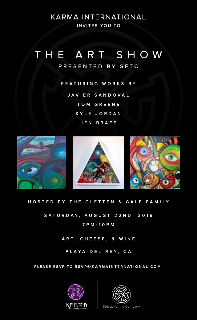 Karma invites you to join us for a night of fine art, wine & cheese hosted in the lovely home of The Gletten & Gale Family. The exhibition will feature contemporary works by Javier Sandoval, Tom Greene, Klye Jordan and Jen Braff. We look forward to a unique evening of art, music and of course good Karma!